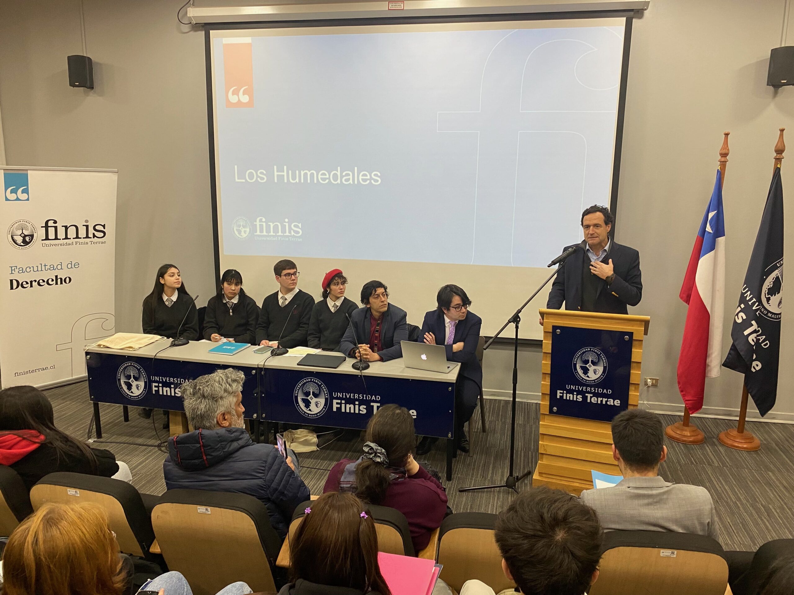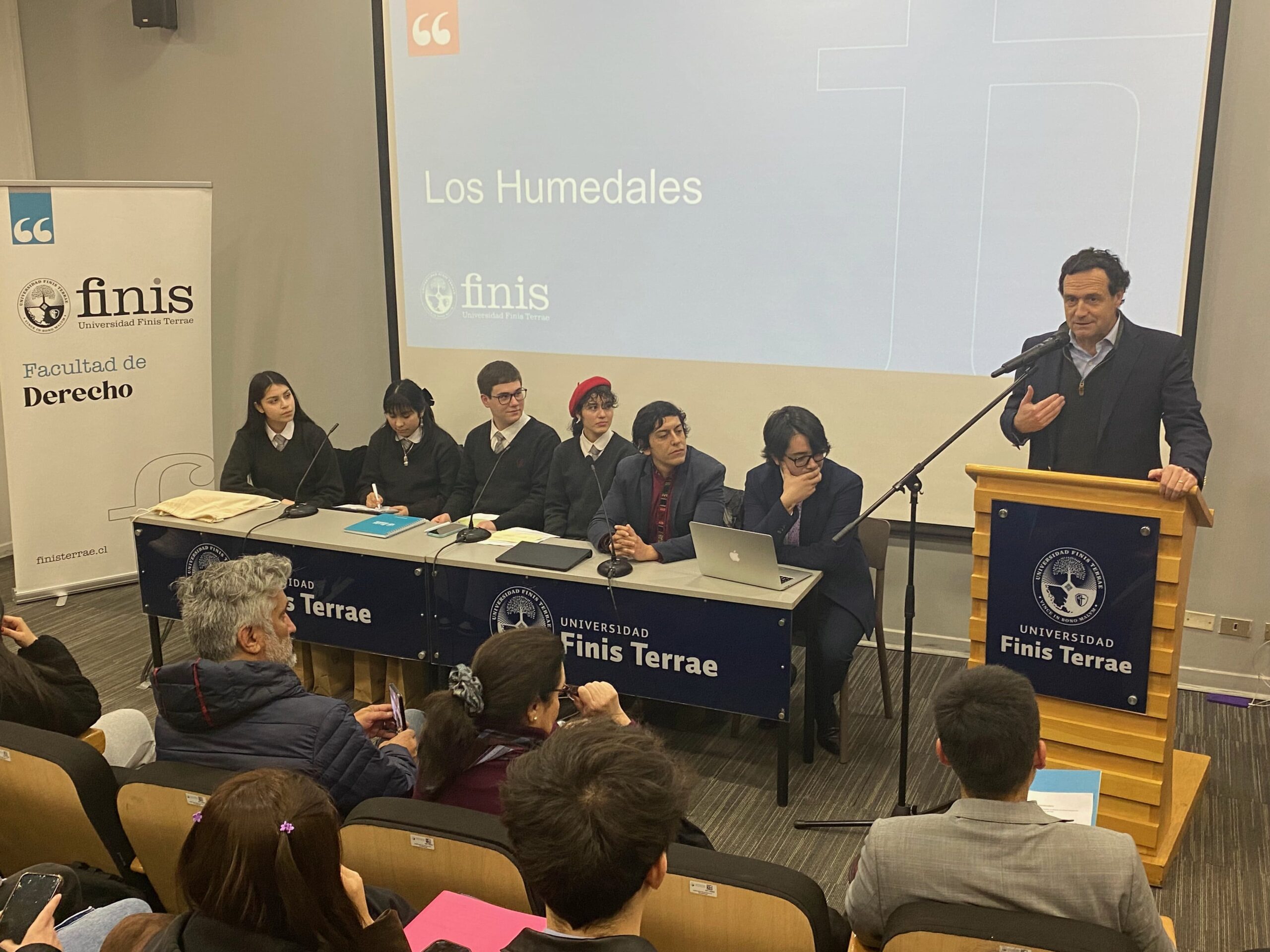 En el marco del Mes de la Sostenibilidad organizado por nuestra Universidad y los procesos de Admisión 2025, el jefe de carrera de la Escuela de Derecho, Felipe Pavez, invitó al grupo de debate “Macarena Valdés” del Liceo Pablo Neruda de Temuco a exponer su propuesta legislativa en torno a la protección de los humedales no urbanos, trabajo desarrollado por dicho grupo de estudiantes de tercero medio, en el contexto de su participación en el Torneo Delibera 2024, certamen interescolar de deliberación y formación cívica organizado por la Biblioteca del Congreso Nacional de Chile.