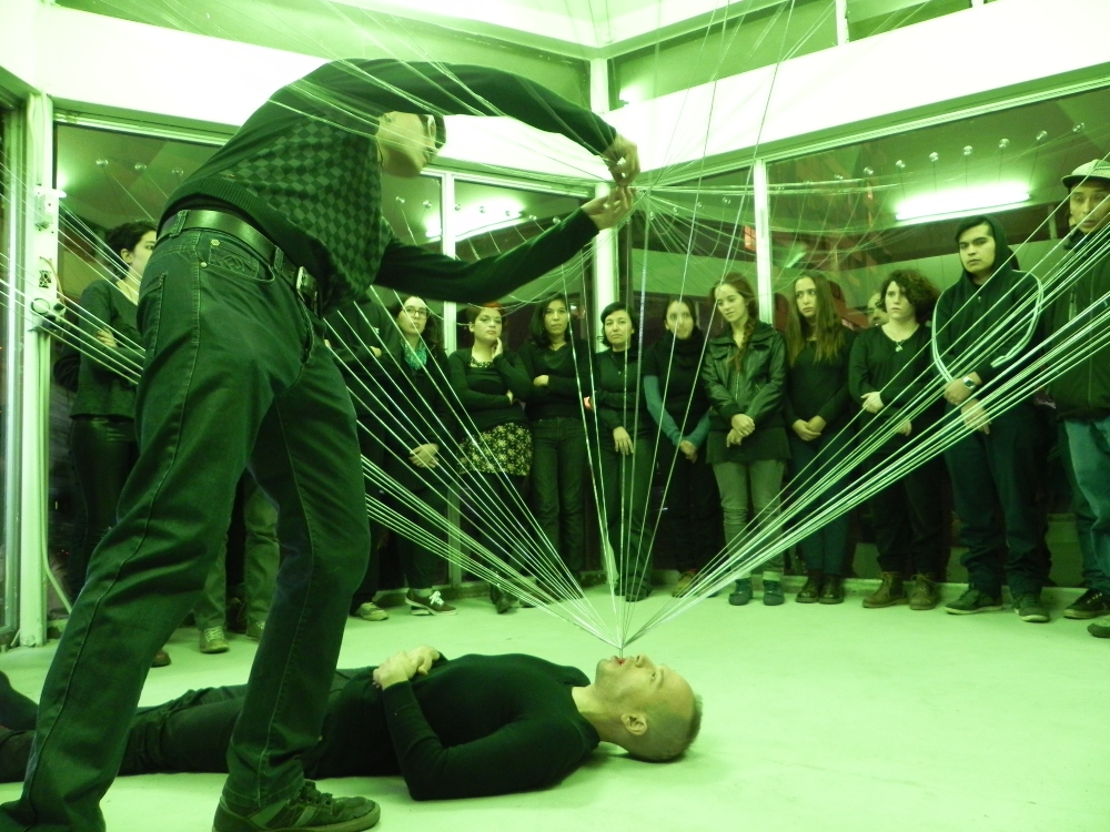 Una de las reflexiones que compartió Mahaluf sobre su proceso de creación artística fue: “No estamos solos en este mundo, por ello el espacio que nos rodea es social y colectivo. La cuestión de la relación entre mi cuerpo y los demás, parte de la posibilidad de comprender que la espacialidad entre los cuerpos, es el vacío revelador a asumir desde otra dimensión, que nos constituye como sociedad. Quería manifestar esta relación a través del cordón elástico.”