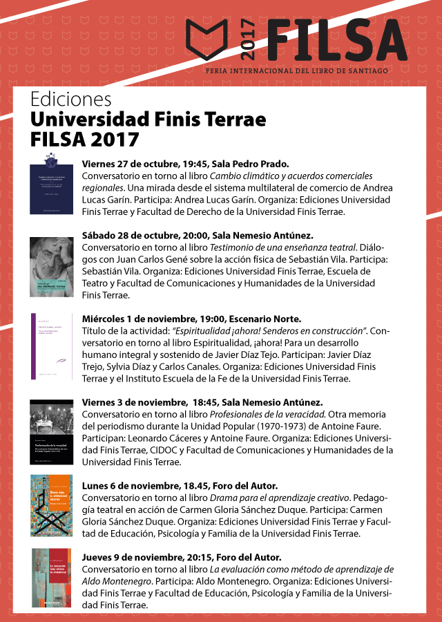 Una vez más, Ediciones Finis Terrae participará en la 37° versión de la Feria Internacional del Libro de Santiago – FILSA 2017. Desde el 26 de octubre al 12 de noviembre en Estación Mapocho, los asistentes podrán disfrutar de charlas, presentaciones de libros, conciertos en vivo, danza, teatro y talleres, entre otras actividades.
