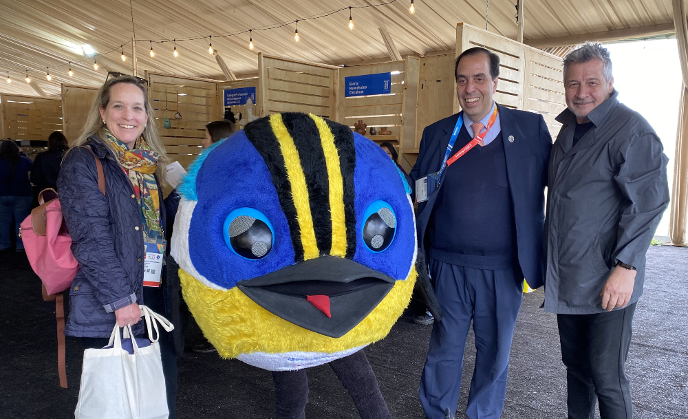 - Lupe Irarrázaval, el rector Cristian Nazer y el decano Enrique Zamudio, junto a “FIU”, mascota oficial de Santiago 2023.