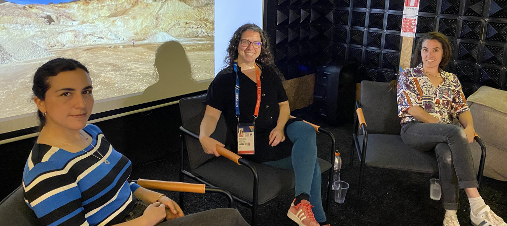 - Las académicas de la Facultad de Artes Catalina Zarzar, Elisa Silva y Carolina Grof en el conversatorio “Cerámica, prácticas tradicionales y contemporaneidad”, transmitido desde el microcine del Pabellón Cultural.