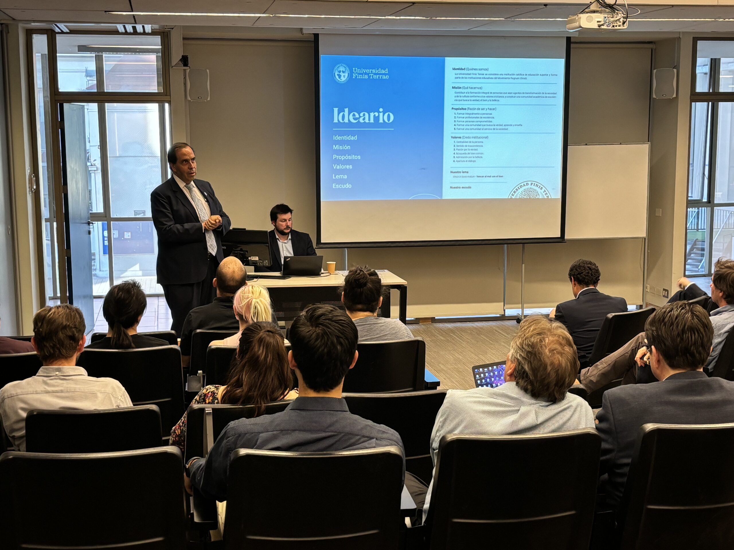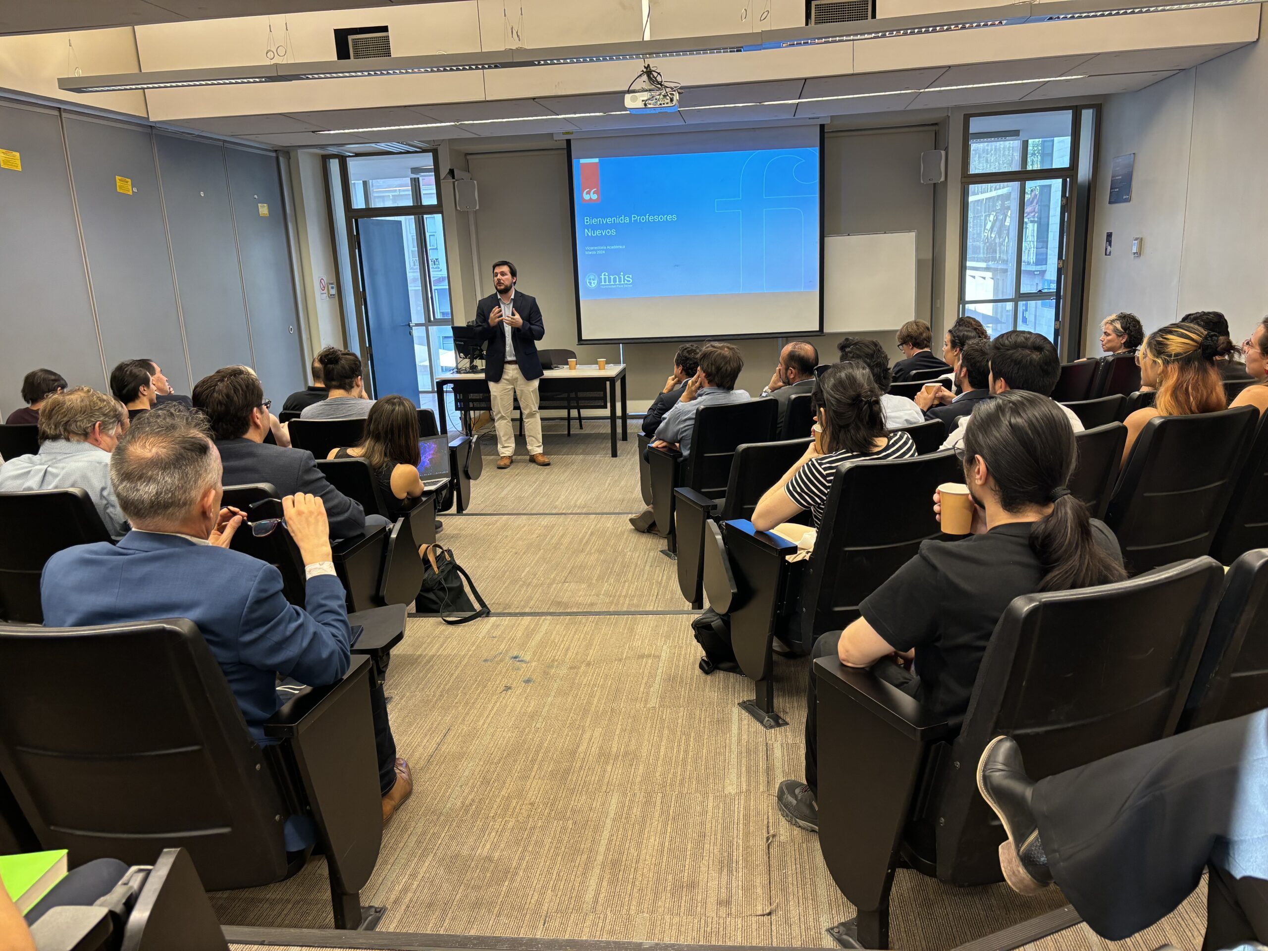 El rector Nazer explicó el ideario de la institución y se refirió a la misión y visión de la U. Finis Terrae; el vicerrector académico hizo un repaso por la historia de la Universidad y remarcó funciones prácticas de la labor docente, lo que luego fue relevado por el director de Gestión y Desarrollo Académico.