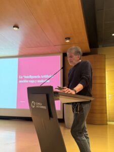 El evento contó con la participación del profesor Claudio Gutiérrez, PhD en Ciencias de la Computación y experto en IA, quien ofreció una perspectiva histórica y técnica sobre la inteligencia artificial. Gutiérrez explicó que la IA surgió hace más de 60 años, enfocándose en la racionalidad y la lógica, dejando de lado aspectos emocionales y biológicos. “La IA, al simular aspectos de la inteligencia humana, ha logrado avances impresionantes en áreas como las tecnologías médicas, pero es fundamental recordar que toda tecnología tiene tanto ventajas como desventajas”, destacó. El también investigador senior del Instituto Milenio Fundamento subrayó la importancia de contar con sistemas robustos de almacenamiento y gestión de datos, comparándolos con la infraestructura de una ciudad, sobre la cual se construye todo lo demás.