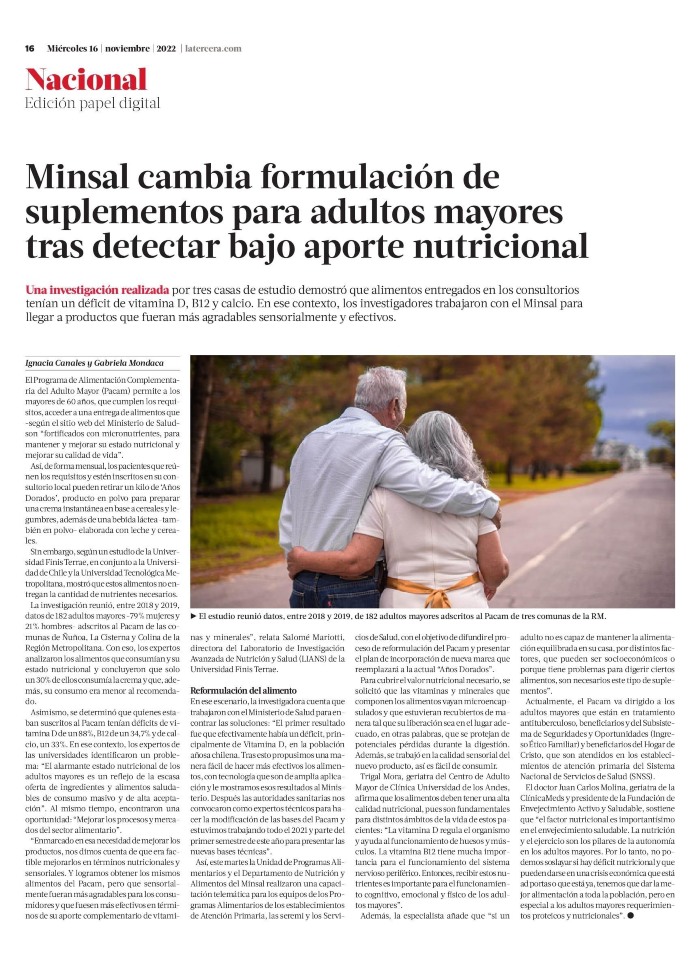 Ante este escenario, el Minsal decidió reformular estos suplementos, incluyendo dentro del proceso a quienes desarrollaron la investigación. “El primer resultado fue que efectivamente había un déficit, principalmente de Vitamina D, en la población añosa chilena. Tras esto propusimos una manera fácil de hacer más efectivos los alimentos, con tecnología que son de amplia aplicación y le mostramos esos resultados al Ministerio”, comentó la Dra. Mariotti al medio.