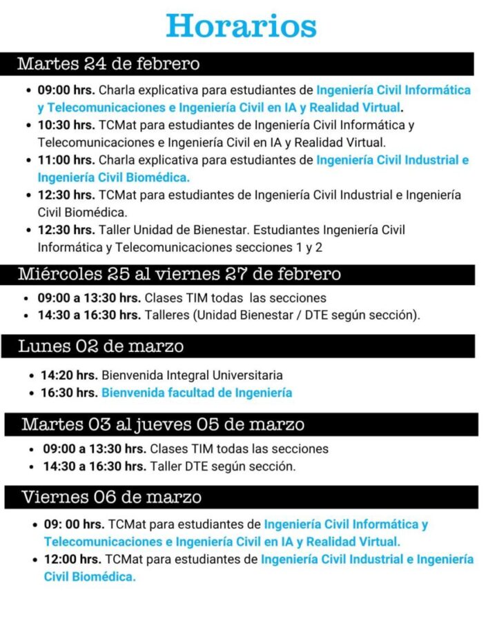 En tanto, los alumnos de cursos superiores de la Facultad de Ingeniería retomarán sus actividades académicas el lunes 9 de marzo, fecha en que se dará inicio regular al semestre para quienes ya cursan la carrera.