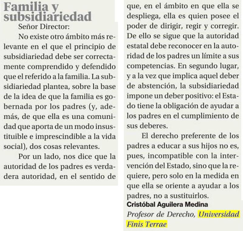 “No existe otro ámbito más relevante en el que el principio de subsidiariedad debe ser correctamente comprendido y defendido que el referido a la familia”, señaló el docente en carta publicada por el vespertino.