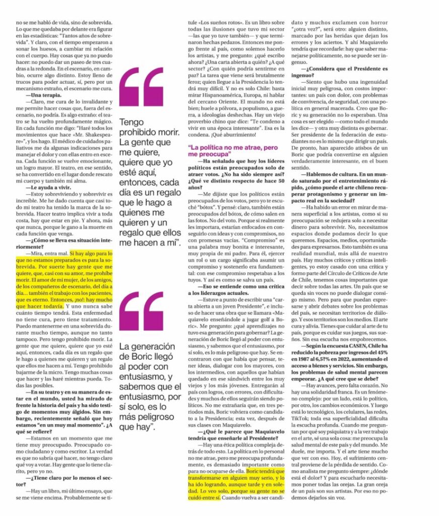 En este contexto, Marco Antonio de la Parra dio una entrevista al diario La Segunda, donde reflexionó sobre su vida profesional, donde ha liderado más de 100 obras de teatro, y explicó cómo vive en la actualidad sus procesos creativos que lo llevarán en octubre de este año a estrenar la obra “Mr. Shakespeare” en el Teatro de La Abadía, en Madrid, España.