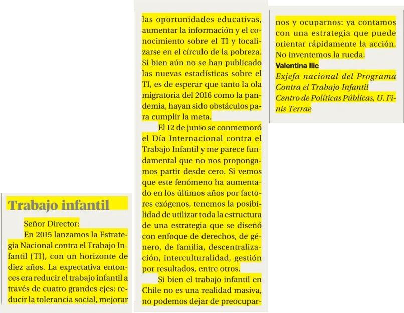 En carta al director del diario La Segunda, Valentina Ilic recuerda que “en 2015 lanzamos la Estrategia Nacional contra el Trabajo Infantil con un horizonte de diez años”, haciendo mención a su etapa vinculada al diseño e implementación de esta iniciativa desde el Ministerio del Trabajo.