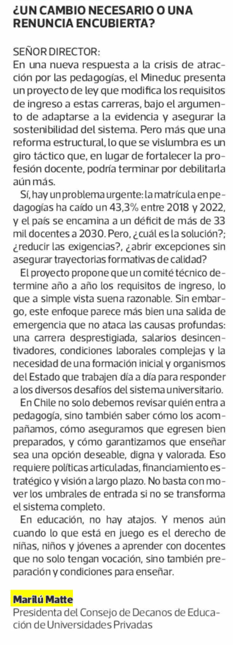 Al respecto, Marilú Matte, decana de la Facultad de Educación, Psicología y Familia de la Universidad Finis Terrae y presidenta del Consejo de Decanos de Educación de Universidades Privadas (Codeup), indicó en columna para La Tercera que si bien la propuesta del Mineduc se hizo “bajo el argumento de adaptarse a la evidencia y asegurar la sostenibilidad del sistema”, esta representaría “un giro táctico que, en lugar de fortalecer la profesión docente, podría terminar por debilitaría aún más”.