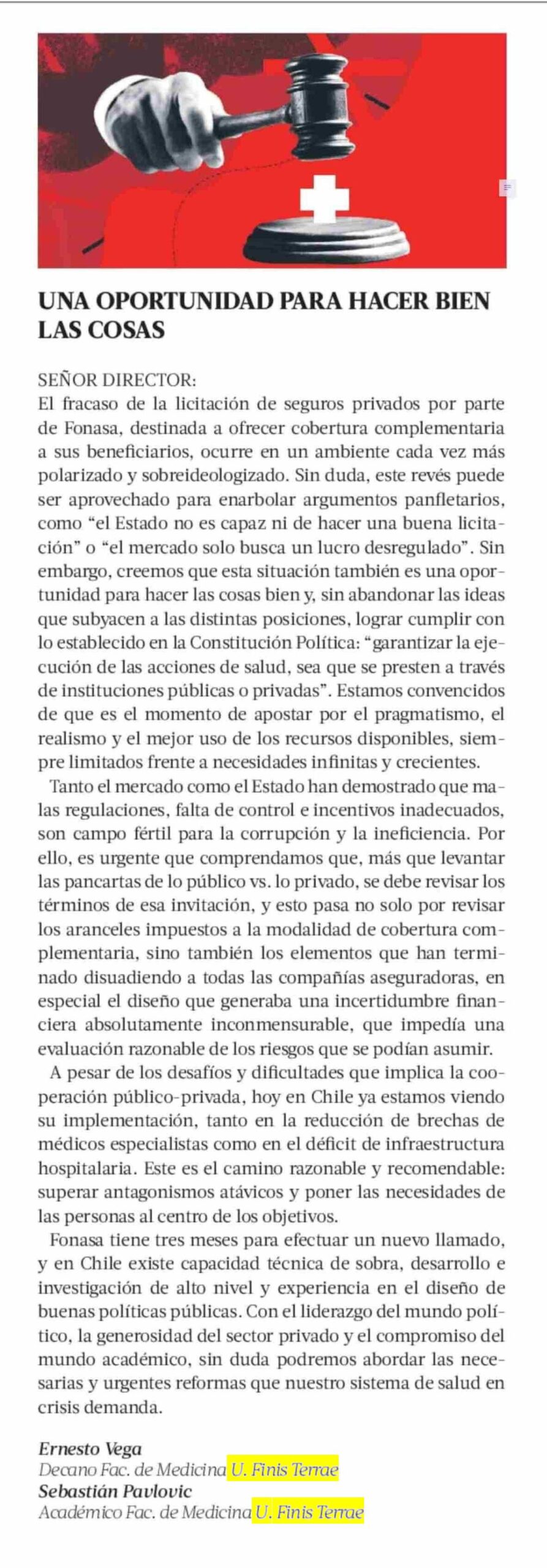 Tras la fallida licitación de Fonasa para implementar la Modalidad de Cobertura Complementaria (MCC) —que no recibió ofertas por parte de aseguradoras privadas— el decano de la Facultad de Medicina de la Universidad Finis Terrae, Dr. Ernesto Vega, y el académico Sebastián Pavlovic publicaron una carta al director en La Tercera.