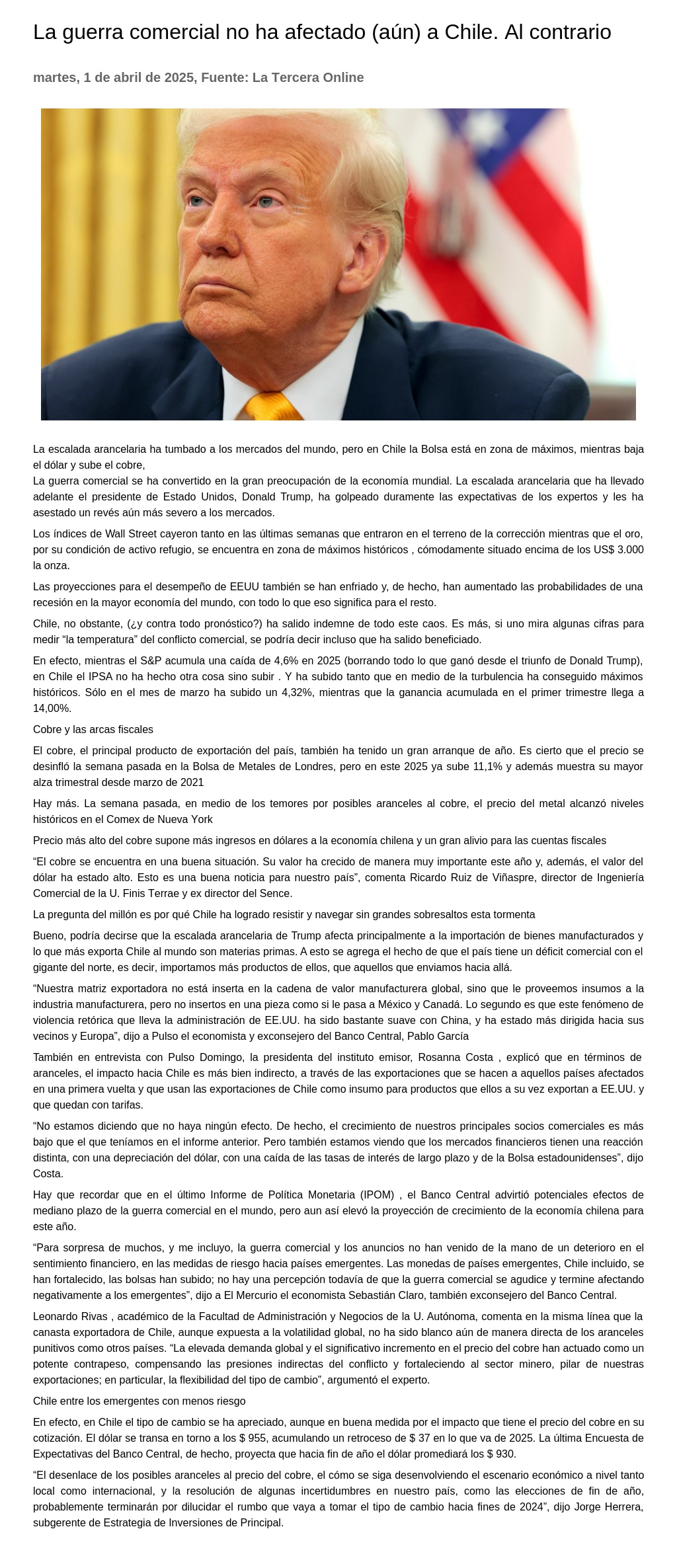El artículo destaca que, mientras Wall Street ha experimentado caídas significativas y el S&P 500 ha retrocedido un 4,6% en 2025, el IPSA chileno ha logrado un crecimiento notorio, alcanzando máximos históricos con un alza del 14% en el primer trimestre del año. Este contraste refuerza la idea de que la economía chilena ha logrado sortear los efectos adversos del conflicto comercial internacional.