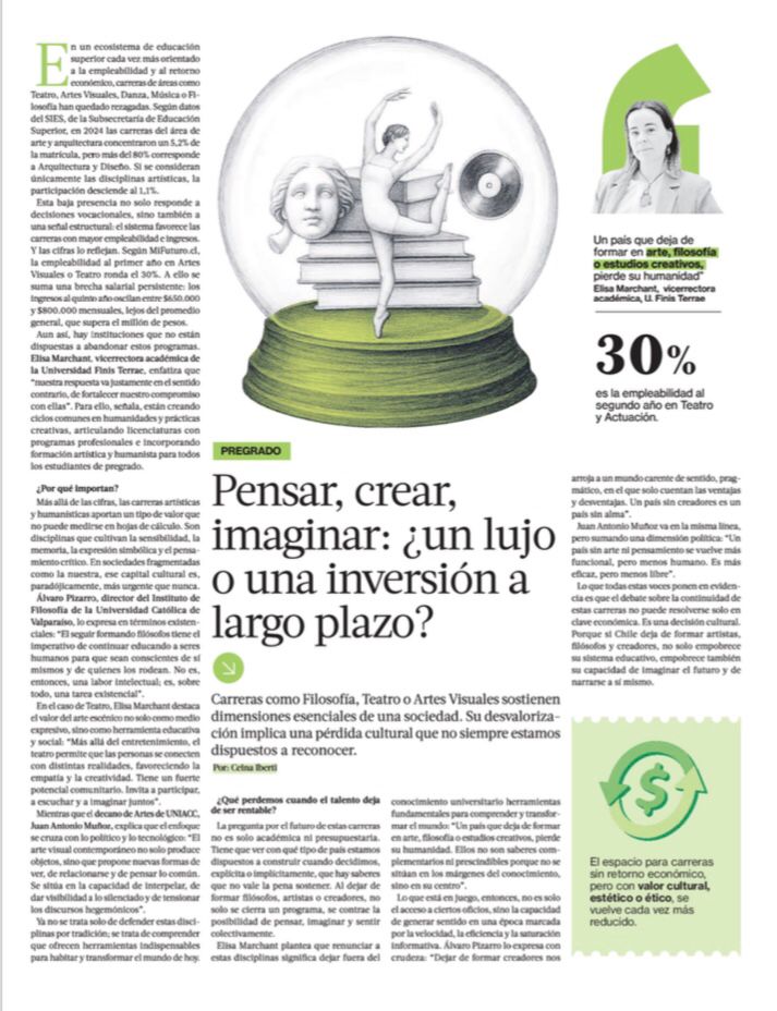 Elisa Marchant, vicerrectora académica de la Universidad Finis Terrae, explica en la nota de La Tercera, que desde la Finis Terrae fortalecen el compromiso con estas carreras y ejemplifica que se están creando ciclos comunes en Humanidades y prácticas creativas, articulando licenciaturas con programas profesionales e incorporando formación artística y humanista para todos los estudiantes de pregrado.