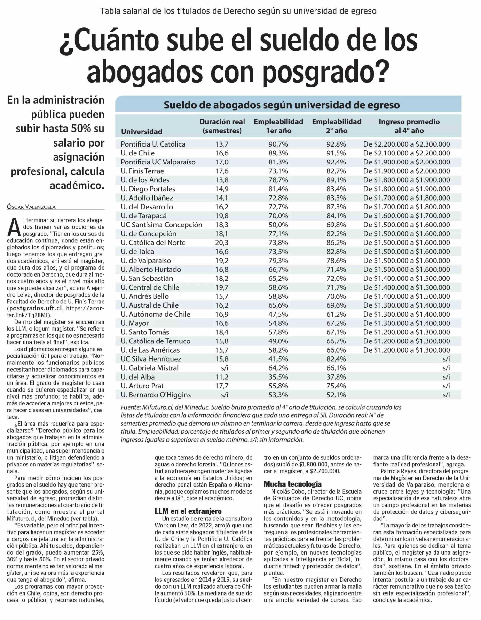 En un reportaje titulado ¿Cuánto sube el sueldo de los abogados con postgrado?, Las Últimas Noticias entrevistó al director de Postgrados de la Facultad de Derecho de la Universidad Finis Terrae, doctor Alejandro Leiva López, en relación a la oferta de postgrados, su impacto en las carreras laborales de los abogados y las temáticas con mayor proyección. Asimismo, el medio escrito más leído del país, publicó que nuestra Facultad se encuentra en el tercer lugar de las universidades con los mayores ingresos de sus egresados al cuarto año de titulación. Le invitamos a leer el reportaje completo en este enlace o a continuación.