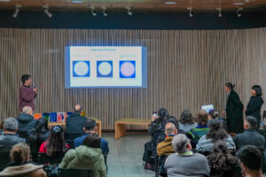 “Lo más profundo es la piel” fue presentado por los estudiantes, egresados y co-ejecutores, Allison Bautista, de la Facultad de Ingeniería; Katerina Quintulem, de la Facultad de Artes; y Diego Irribarra, de la Facultad de Medicina. “El proceso incluyó la creación de un biomaterial orgánico utilizando tecnología de impresión en 3D para construir un andamio a partir de miel y alginato. En este andamio se integraron células de la piel, como los fibroblastos, lo que le confiere propiedades mecánicas importantes, como flexibilidad y compresión, esenciales tanto para aplicaciones en medicina como en arte”, explicó Katerina Quintulem.