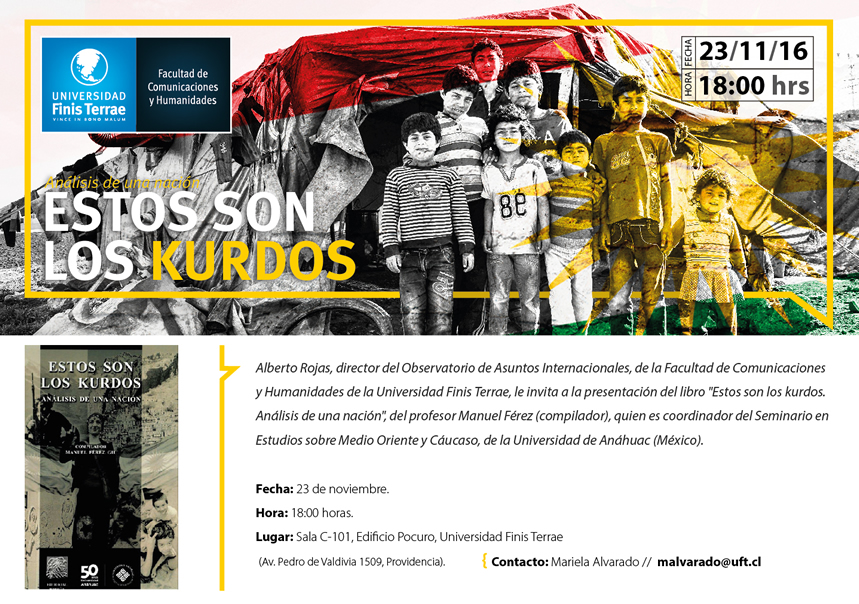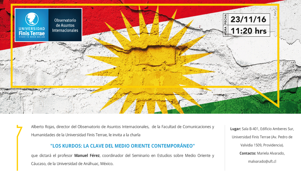 La charla llamada “Los kurdos: la clave del Medio Oriente contemporáneo”, organizada por el Observatorio de Asuntos Internacionales de la Facultad de Comunicaciones y Humanidades, y se llevará a cabo el 23 de noviembre, en la Universidad Finis Terrae. La actividad, que se realizará en la sala B401, del Edificio Amberes Sur, abordará temas como las propuestas políticas alternativas que tienen hacia Medio Oriente, el rol de la mujer en la sociedad kurda y el nacionalismo kurdo contemporáneo.