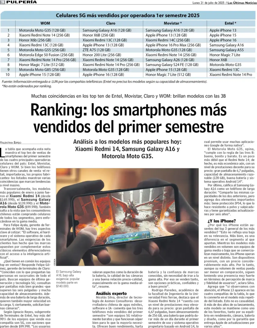 El académico de la escuela de Ingeniería Civil Informática y Telecomunicaciones, Rodrigo Paredes, fue convocado por el diario Las Últimas Noticias, para analizar los modelos de teléfonos celulares más vendidos durante el primer semestre de 2025 en nuestro país.