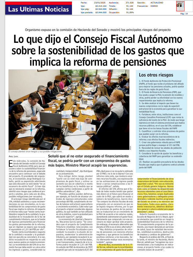 Así como en LUN, donde Ruiz de Viñaspre coincidió con los riesgos de gasto fiscal, tal como lo advirtió el Consejo Fiscal Autónomo, también realizó vocerías en medios regionales como fue el diario El Heraldo y radio Ancoa, ambos de la región de El Maule.
