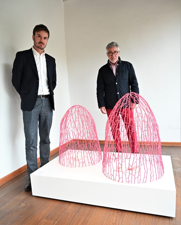 - Martín Vial, director ejecutivo de la Corporación Cultural de Las Condes, y Fernando Moya, productor de Artes Visuales, junto a la obra “Ensayo para reparar algo”, de Andrea Silva.