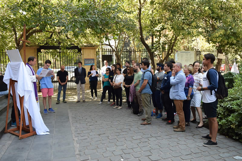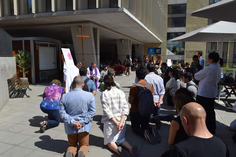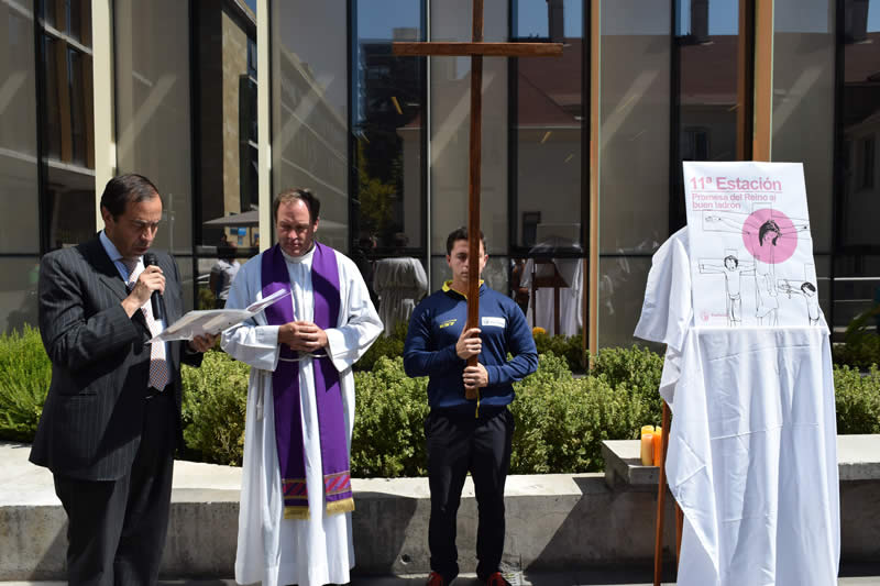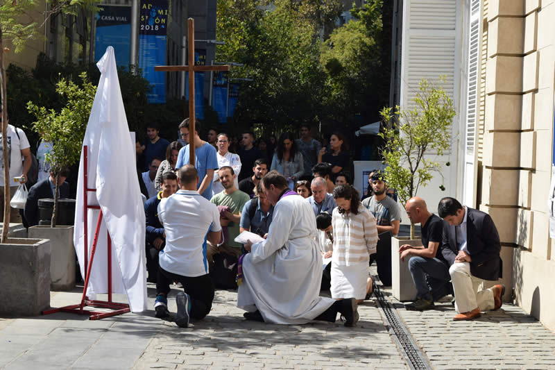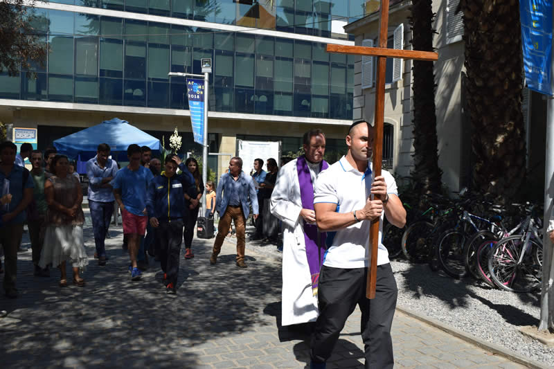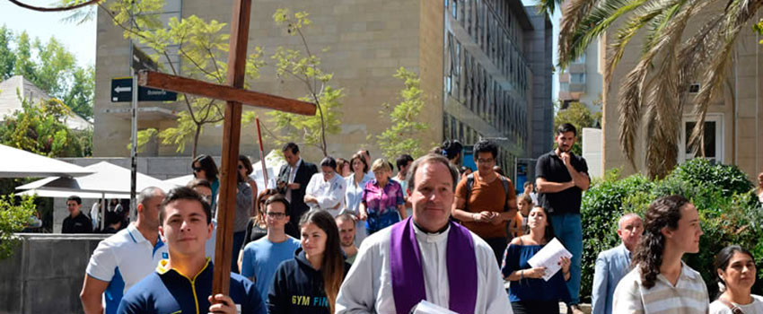 En el marco de la Semana Santa y como todos los años, la Pastoral de la Universidad Finis Terrae realizó el tradicional Vía Crucis en el patio de la Casa Central de la Institución, con el objetivo de hacer presente la fe cristiana en la Comunidad Universitaria.