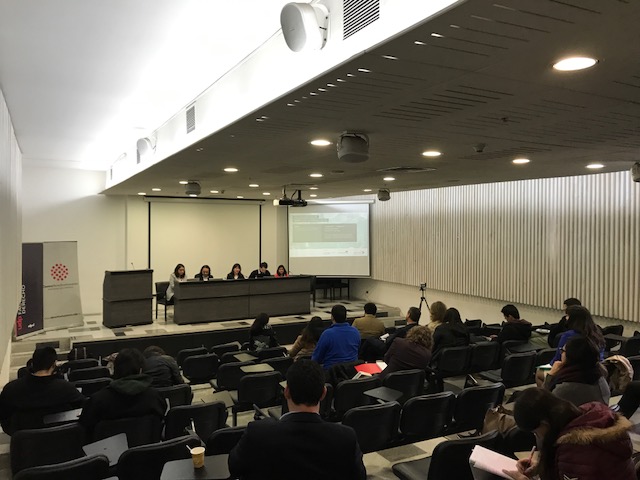 Las Asistentes de Investigación y Estudiantes de la Facultad de Derecho, María Constanza Cubillos y Denisse Hernández expusieron también los resultados de sus respectivas investigaciones. María Constanza realizó una ponencia sobre “Bienes comunes y protección del derecho internacional de un sujeto no humano”, en torno a un caso de habeas corpus a favor de un chimpancé perteneciente al zoológico de Mendoza (Argentina), que ordenó su traslado a la República de Brasil. La ponencia abordó el concepto de bienes comunes del Derecho Internacional y en particular, el de los animales como bienes comunes o “commons”, estableciendo una conexión con el principio de equidad intergeneracional. A su vez, Denisse Hernández abordó el tema de la ley de cuotas en el sistema electoral chileno.