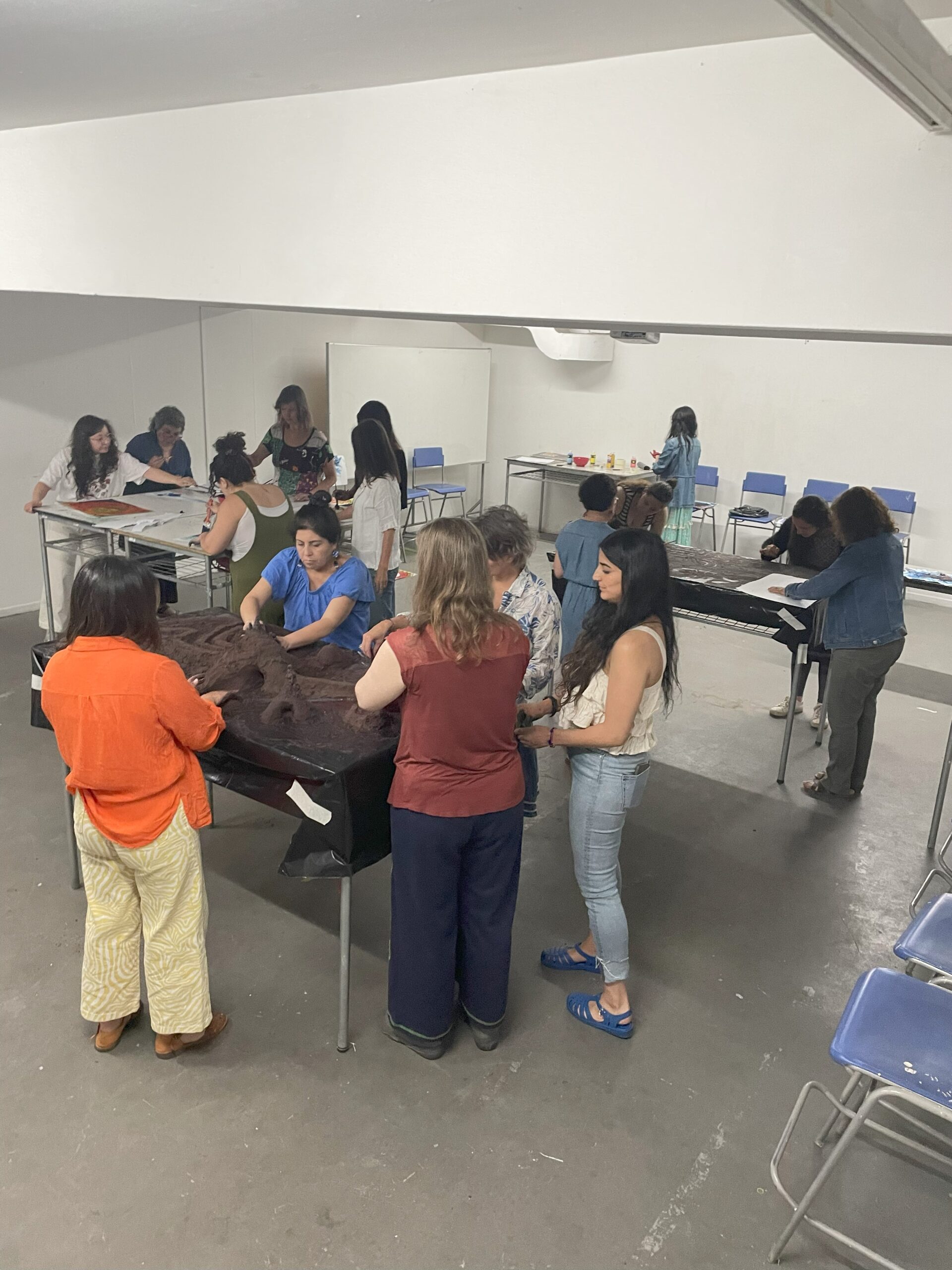 El segundo momento de este encuentro fue protagonizado por egresadas del magíster quienes compartieron sus proyectos actuales. Javiera Asenjo Muñoz, artista visual, tejedora y arteterapeuta, investiga las tradiciones textiles latinoamericanas para abrir espacios de transmisión que permitan el acceso a la práctica y el conocimiento de los tejidos de nuestro territorio. El tejido, explica, es comprendido como una tecnología que permite conectar con memorias ancestrales y espacios de bienestar y cuidado comunitario. Javiera compartió con el grupo el proceso de creación de su Laboratorio de la Lana, espacios colectivos donde diversas comunidades aprenden y comparten prácticas de hilado. Destacó el potencial del textil para conectar con el flujo vital del momento presente, en oposición al letargo de la sobre estimulación y enajenación de la vida contemporánea.