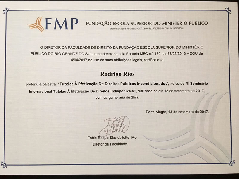 Dicho seminario estuvo dirigido a alumnos de la Maestría en Derecho de esa casa de estudios. El profesor Ríos participó del primer panel junto al Dr. Bruno Heringer, siendo moderador de la mesa el Dr. Rogério Gesta Leal.