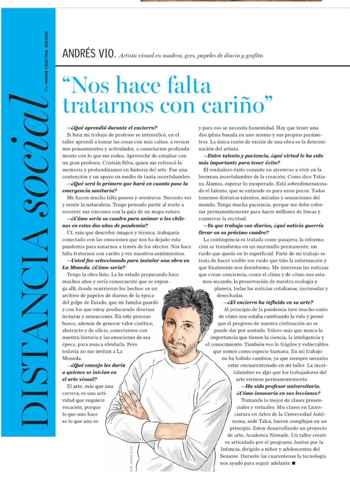 En una entrevista en la Revista Ya de Diario El Mercurio, Andrés Vio, artista visual y egresado de la Escuela de Artes Finis Terrae, comentó cómo el encierro ha afectado en su arte y entregó consejos para quienes se están iniciando en el mundo artístico.