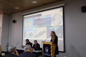 El programa contempló tres mesas temáticas. La primera de ellas, titulada “Geopolítica de los Mares”, fue moderada por el investigador Luis Lira y contó con las exposiciones de la candidata a doctor María José Piñeiro, coordinadora del Centro de Estudios Navales y Marítimos, y de Alberto Rojas, director del Observatorio de Asuntos Internacionales de la Universidad Finis Terrae. Ambos expositores analizaron el escenario marítimo actual como un espacio de competencia estratégica y cooperación internacional, especialmente relevante ante la reconfiguración de rutas y alianzas globales.