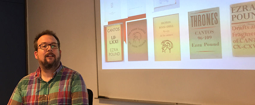 Parker, quien también es poeta, impresor y editor de Crater Press, habló acerca de la relación de la poética de Pound con los ideogramas chinos y la actualidad de su obra a través del reciente trabajo del artista italiano Giorgio Griffa, Canone Aureo 309 (E Pound) (2017), ligado al movimiento del “arte povera”. Para concluir, realizó una lectura bilingüe de sus poemas a los asistentes.