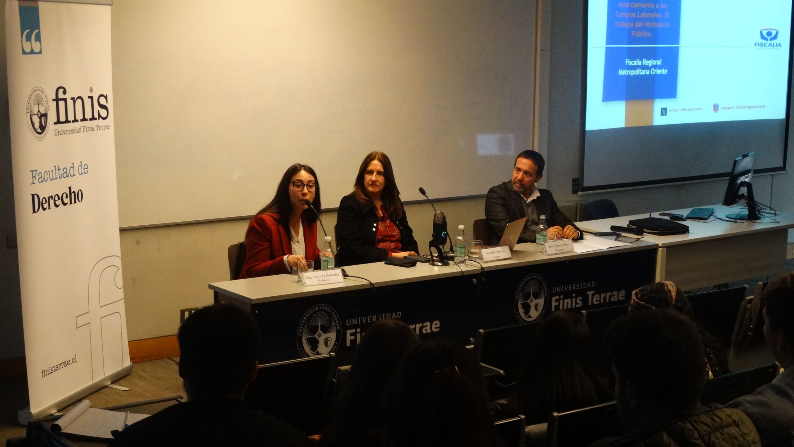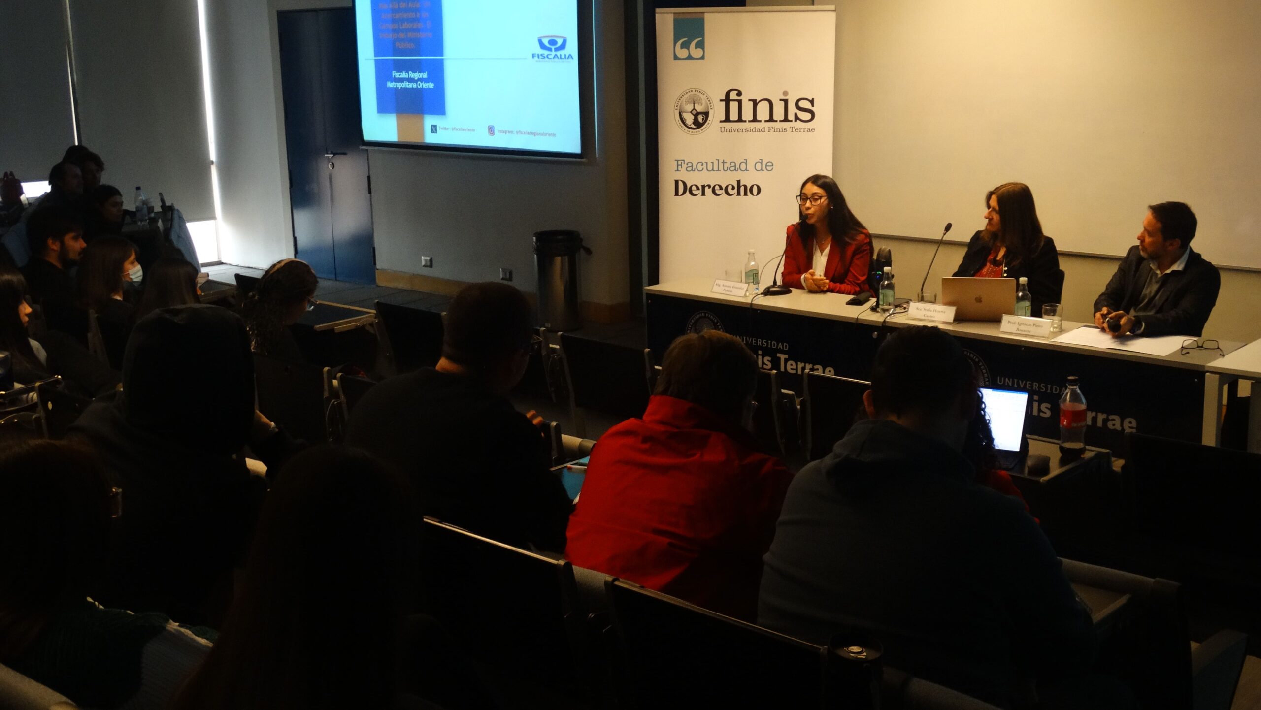 Con una explicación de la estructura organizacional al interior del Ministerio Público y los tipos de delitos que las distintas fiscalías persiguen, la Jefa de RR.HH de la Fiscalía Regional Metropolitana Oriente y docente de postgrados en el área de la psicología jurídica y victimología en diversas universidades, Sofía Huerta Castro, dio inicio a la charla de inserción laboral Más allá del aula: el trabajo del Ministerio Público, encuentro que tuvo por finalidad explicar a nuestros estudiantes interesados en el derecho penal, los procesos de postulación para trabajar en la fiscalía, así como los detalles de la pasantía en esa institución a la que pueden postular desde tercer año, gracias al convenio que une al Ministerio Público y la Facultad de Derecho de la U. Finis Terrae.