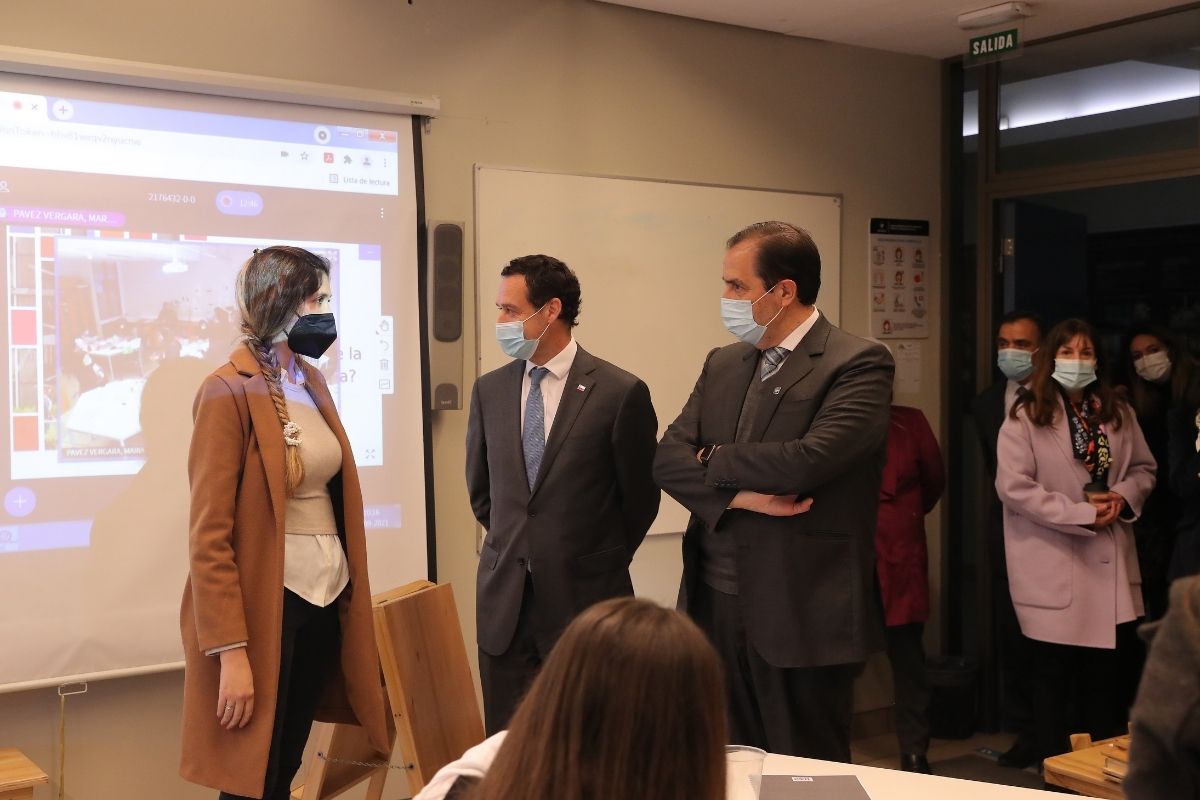 La visita finalizó con un recorrido por salas de clases que están modalidad híbrida, es decir, en las que un grupo de estudiantes está en forma presencial junto a un profesor y otro grupo está conectado online, participando en vivo y en directo de lo que ocurre en el aula.