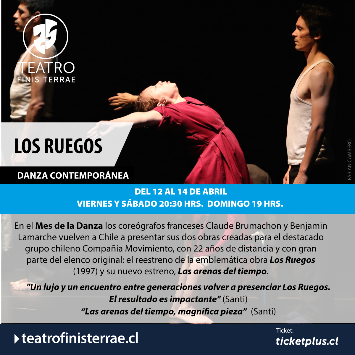 Los coreógrafos franceses Claude Brumachon y Benjamin Lamarche, laureados creadores que durante 25 años fueron directores del Centro Coreográfico Nacional de Nantes (Francia), vuelven a Chile a presentar sus dos obras creadas para la destacada agrupación chilena Compañía Movimiento: el reestreno de la emblemática obra Los Ruegos de 1997 con parte de su elenco original, y 22 años después, la creación de su nueva obra Las Arenas del Tiempo.