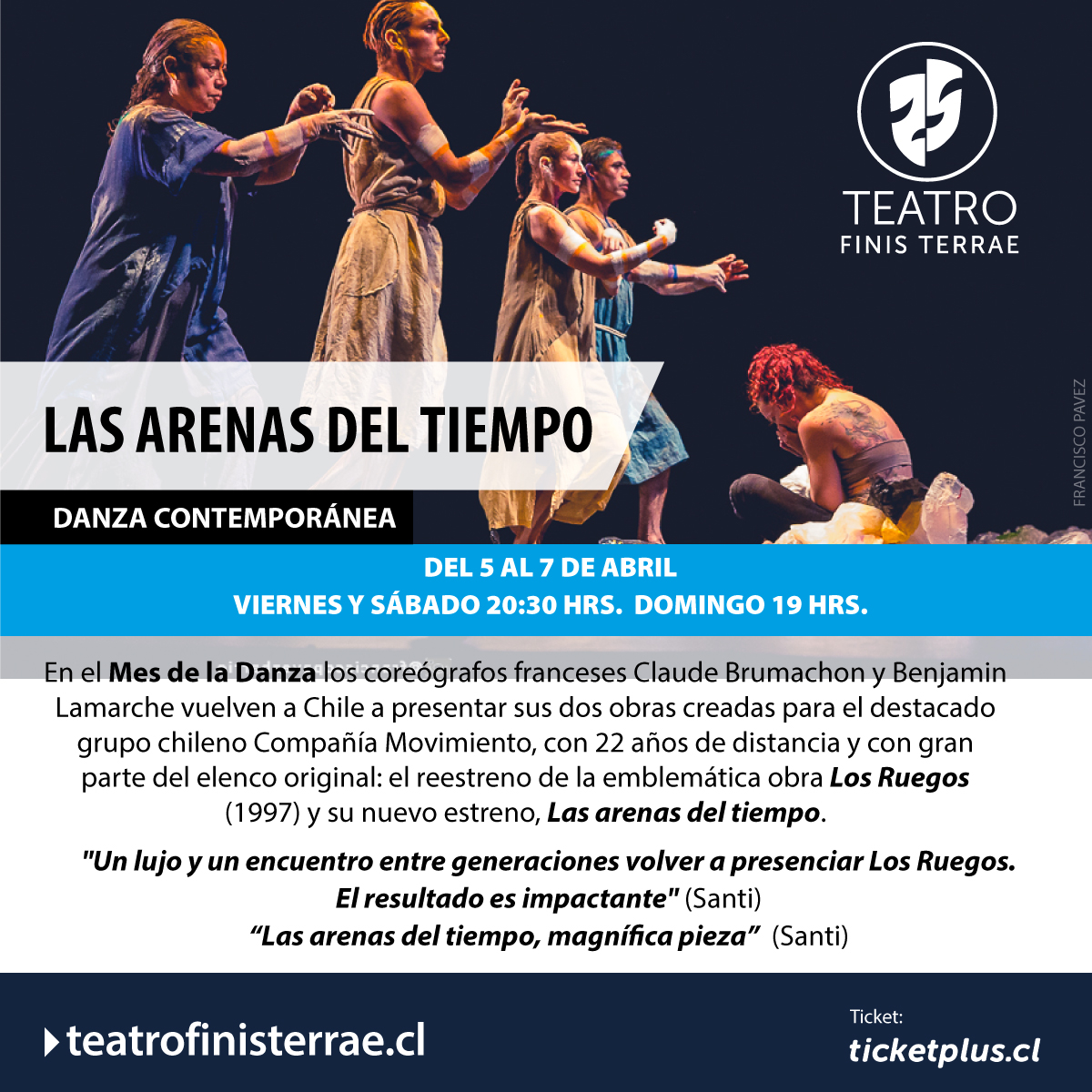 Los coreógrafos franceses Claude Brumachon y Benjamin Lamarche, laureados creadores que durante 25 años fueron directores del Centro Coreográfico Nacional de Nantes (Francia), vuelven a Chile a presentar sus dos obras creadas para la destacada agrupación chilena Compañía Movimiento: el reestreno de la emblemática obra Los Ruegos de 1997 con parte de su elenco original, y 22 años después, la creación de su nueva obra Las Arenas del Tiempo.