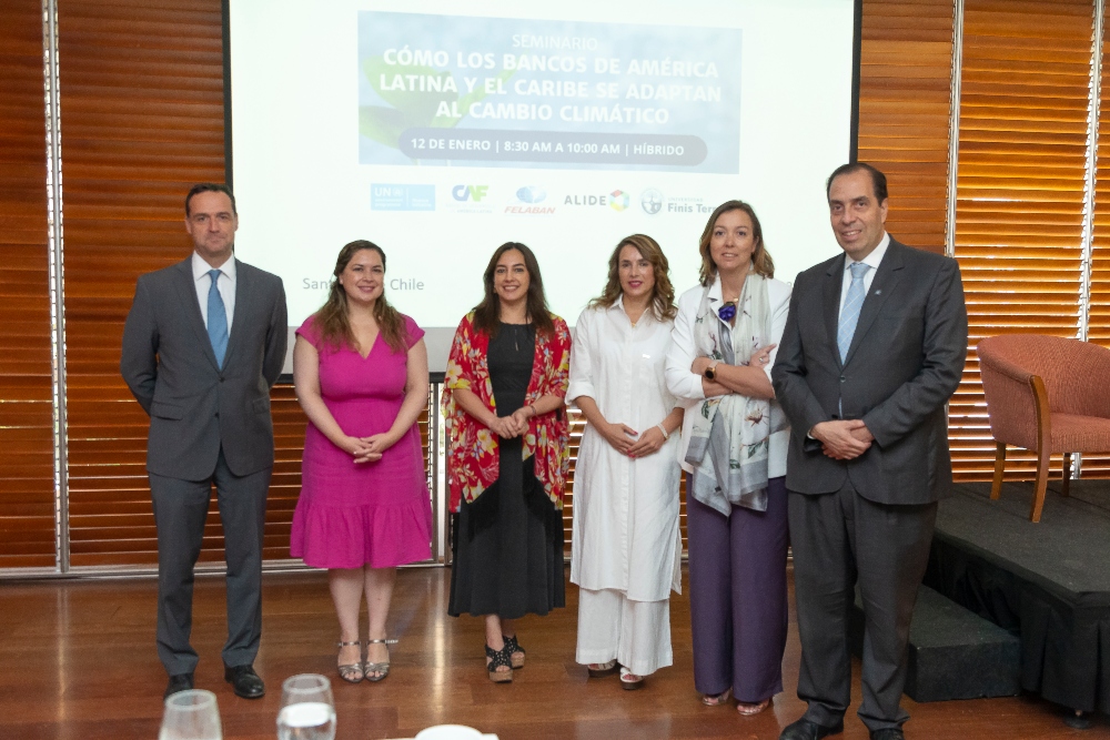 Tras la presentación del reporte “Cómo los bancos de América Latina y el Caribe se adaptan al cambio climático”, se estrenó el Centro de Economía y Negocios Sostenibles Finis Terrae. En la foto, Juan Eduardo Vargas, vicerrector académico; Solange Encina, coordinadora de Finanzas Verdes de Banco Estado; Carolina López, representante de UNEP FI en Chile; Beatriz Calderón, directora del Diplomado en Finanzas Sostenibles; Cristina Hube, decana de la Facultad de Economía y Negocios, y Cristian Nazer, rector de la Universidad Finis Terrae.