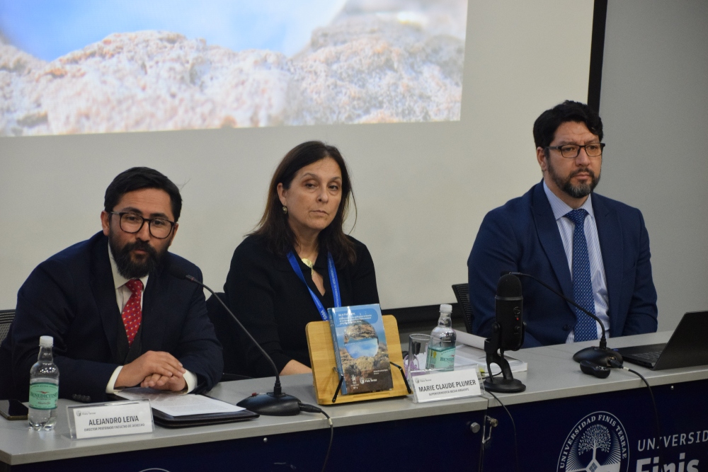 La Facultad de Derecho presentó “Ius et Finis Terrae”, la primera obra de una colección que aborda con estudios e investigaciones el debate medioambiental chileno. En la foto, Alejandro Leiva, director de Postgrados de Derecho; Marie Claude Plumer, superintendenta del Medio Ambiente, e Iván Hunter, ministro del Tercer Tribunal Ambiental.