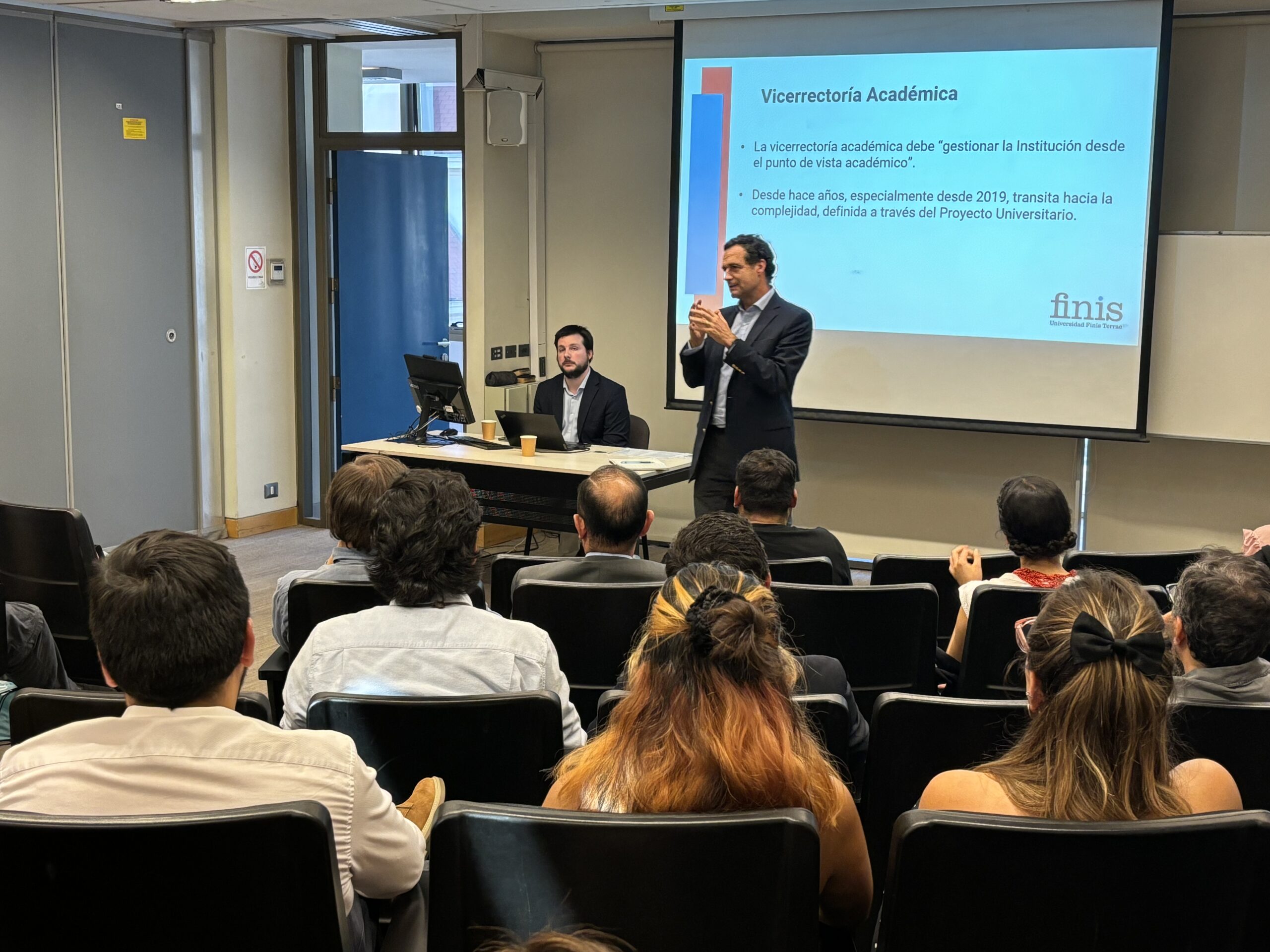 El rector Nazer explicó el ideario de la institución y se refirió a la misión y visión de la U. Finis Terrae; el vicerrector académico hizo un repaso por la historia de la Universidad y remarcó funciones prácticas de la labor docente, lo que luego fue relevado por el director de Gestión y Desarrollo Académico.