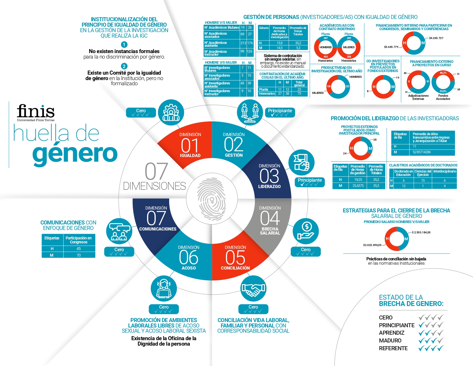 La Huella de Género es una herramienta de autoevaluación que permite diagnosticar, a través de indicadores consensuados, cómo se está avanzando en materia de igualdad de género en el ecosistema científico. La versión institucional de este diagnóstico fue construida con insumos de diversas unidades: la Dirección de Investigación y Doctorado, la Dirección de Creación Artística, la Dirección de Aseguramiento de la Calidad, la Oficina de Promoción de la Dignidad de la Persona y académicas de las facultades de Derecho, Educación, Psicología y Familia.
