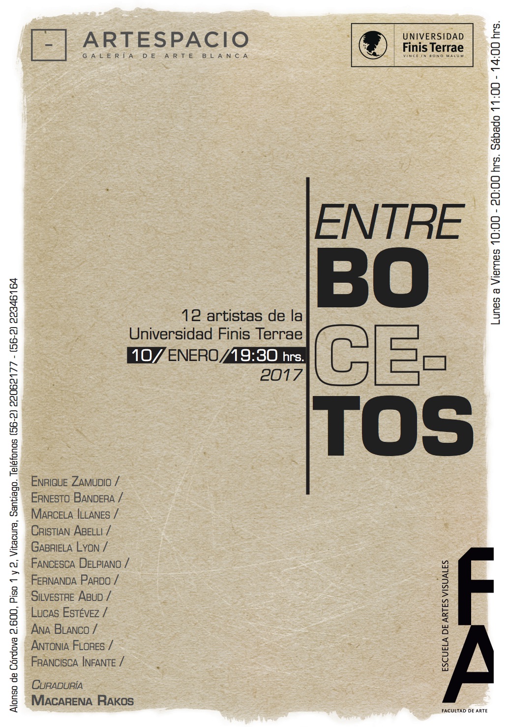 Una nueva propuesta presentará la Universidad Finis Terrae a Galería Artespacio; esta vez compuesta por docentes y egresados de la casa de estudios, incluyendo al decano de la Facultad de Arte, Enrique Zamudio, quienes exhibirán parte de sus obras y sus bocetos desde el 10 de enero al 1 de marzo de 2017.